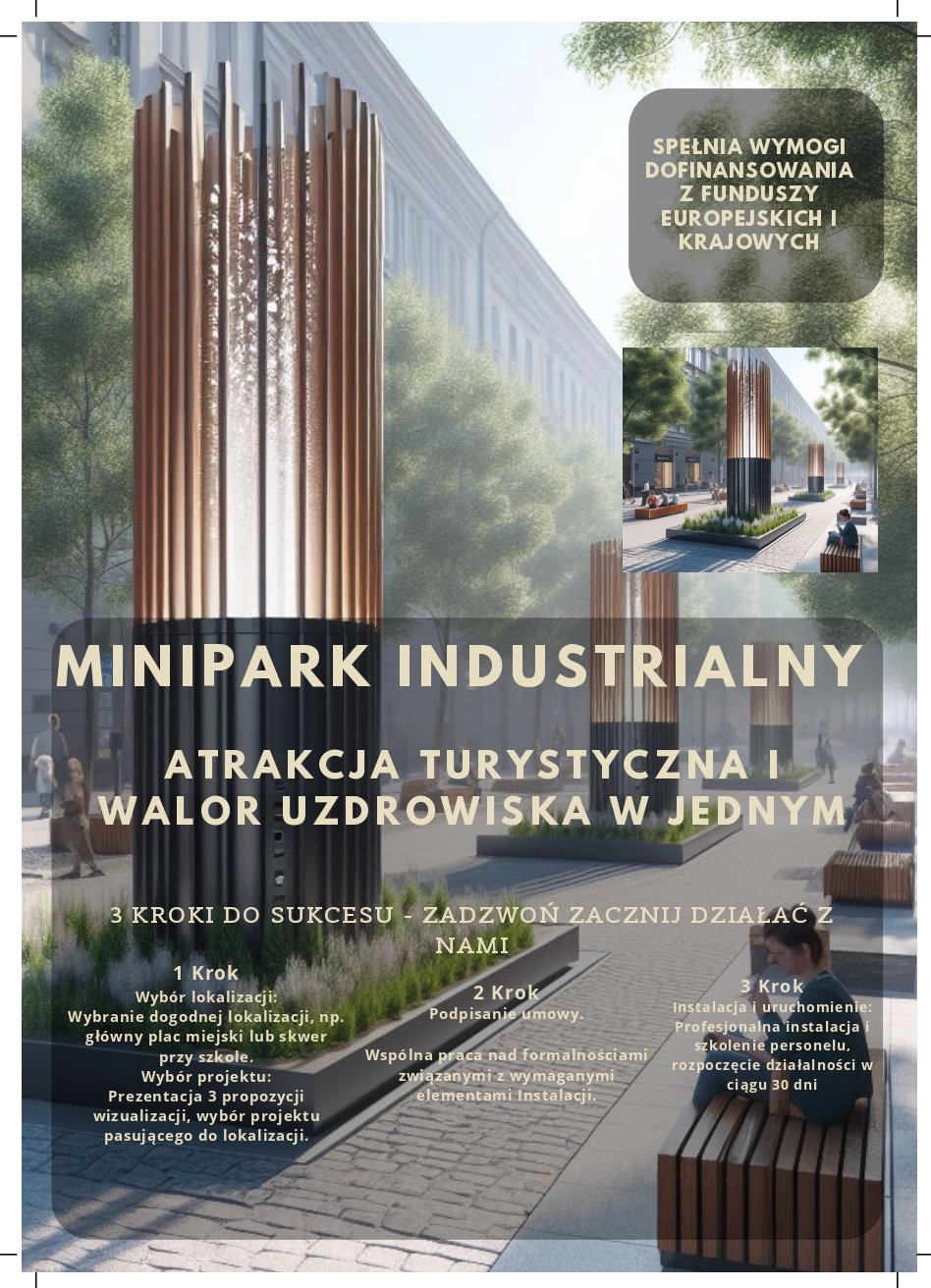 MiniPark z Kolumnową Tężnią Solankową (1 lub kilka) to urokliwe miejsce, gdzie tężnia pełni główną rolę, emanując leczniczymi właściwościami soli. Otoczony zielenią, park oferuje harmonię i zdrowotne korzyści. Spacerując po ścieżkach, doznajemy orzeźwiającego powietrza nasyconego mikrocząstkami soli, korzystnych dla układu oddechowego. Ławeczki i stoliki zachęcają do chwil odpoczynku wśród przyjaznej atmosfery. Wieczorami oświetlenie nadaje parkowi magiczny wygląd, tworząc idealne miejsce na wieczorne spacery. Roślinność stanowi naturalne ogrodzenie, zapewniające prywatność.
